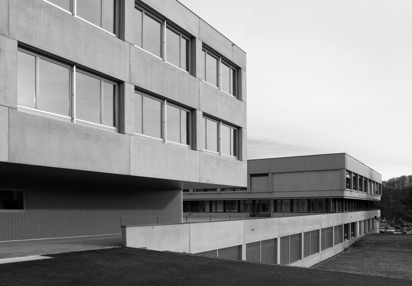 Der Neubau erweitert das bestehende Gebäude zu einem, dem ansteigenden Gelände folgenden Gesamtkörper. Die Volumetrie gliedert sich in drei Teile: den Altbau, den Neubau und die dazwischenliegende Terrasse. Die Terrasse wird zum neuen zentralen Aussenraum der Schulanlage und verbindet die gegensätzlichen Qualitäten des Ortes. Der zweigeschossige Mehrzwecksaal wird direkt vom Foyer erschlossen. Durch die direkte Verbindung zu Mensa und Foyer, sowie zu Fenstern zum Gang im ersten Obergeschoss ergeben sich spannende räumliche Bezüge. Die Betonelementfassade orientiert sich an der Sichtbetonfassade des bestehenden Gebäudes und unterstreicht die Einheit des neuen Schulhauses.